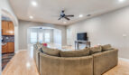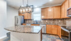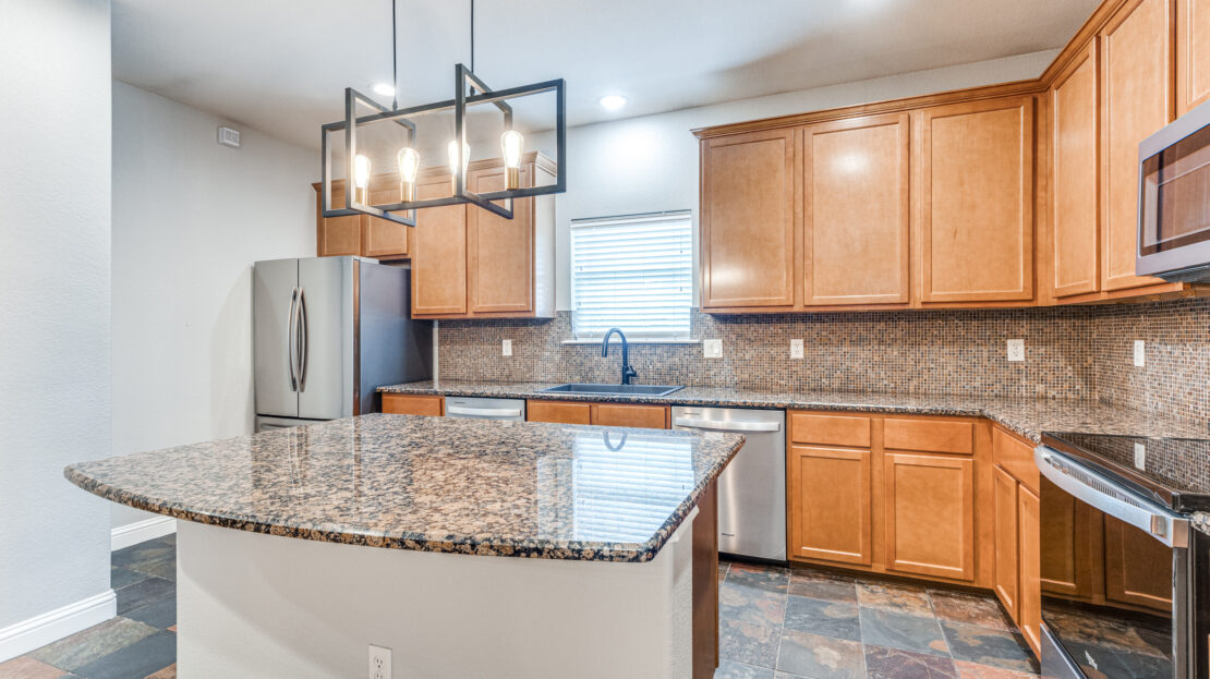 Open floorplan between kitchen, dining room, and living room. Common areas and bedrooms feature maple wood floors. Kitchen includes island, granite countertops, stainless steel appliances, and slate floors. Large bedrooms with walk in closets.