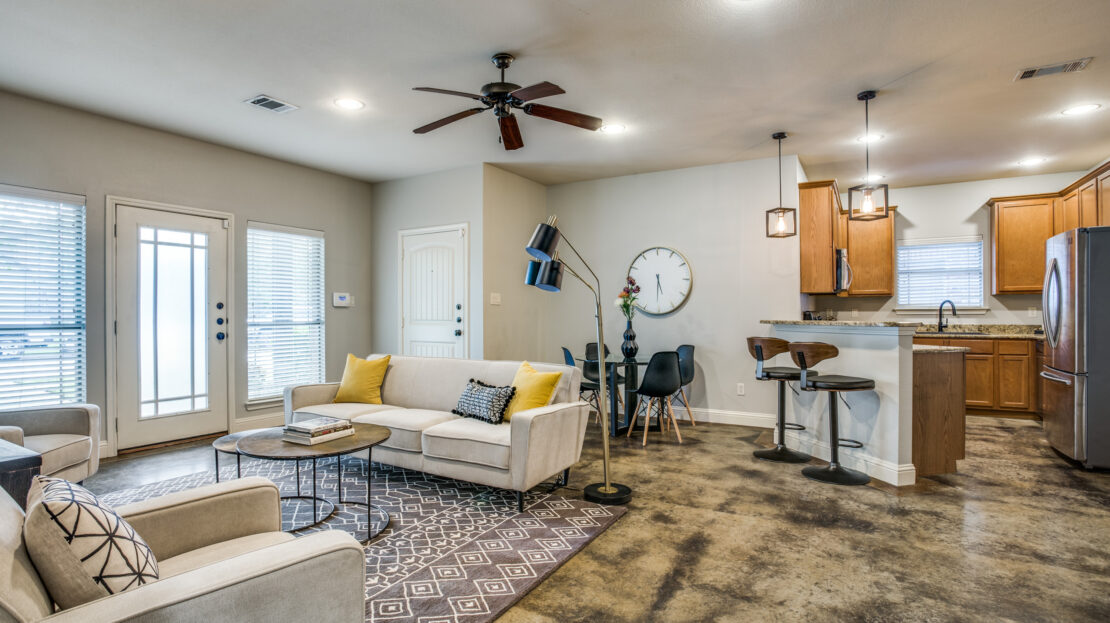 DESCRIPTION: Fabulous downstairs duplex walking distance to TCU. Open floorplan between kitchen, dining room, and living room. Common areas and bedrooms feature stained concrete floors. Kitchen includes breakfast bar, granite countertops, stainless steel appliances. Large bedrooms with walk in closets. Master bath includes jacuzzi tub. Lawn care provided. 3 covered parking spots.